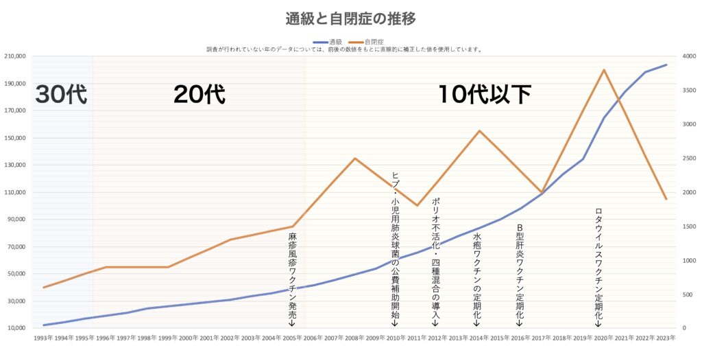 特に注目すべきは、ヒブ・小児用肺炎球菌ワクチンの公費補助が始まり、ポリオ不活化や四種混合の導入など、小児へのワクチン接種スケジュールが劇的に過密化した2010年代以降、その増加ペースが加速している点です。
